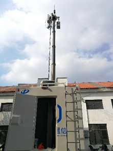 这是一种常见的应急移动通讯基站。它是一部厢式卡车,车厢分前后两个隔离的舱,前舱用于放置通讯机,后舱用于安装升降杆,顶部有三个板状天线。