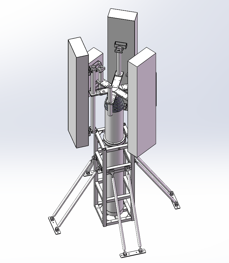 这是一种常见的移动通讯基站。它是一个金属结构方舱,升降杆垂直竖立在舱体中,升降杆上部有一个防水法兰与仓顶板连在一起,升降杆底部法兰安装在舱底板上,升降杆顶部露在舱外。顶部法兰上可安装板状天线,天线采用现场安装方式。