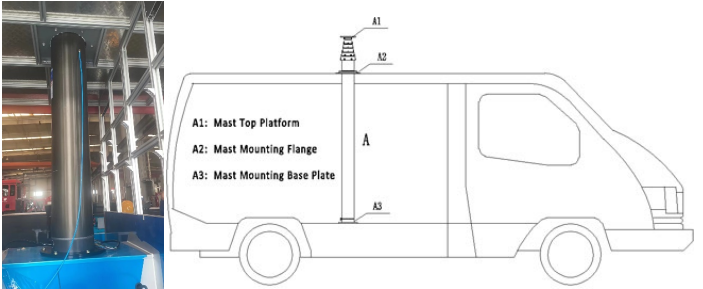 车厢顶部开孔,用于安装升降杆,升降杆上部与车厢连接部分用防水法兰固定,底部法兰与车厢底盘固定。