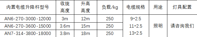 该升降杆是HYML近几年特别受客户欢迎的大型内置电缆照明升降杆,图片为在球场升降照明的应用。采用特殊材料制造的专用螺旋电缆,并将电缆置于升降杆内部,抗疲劳、耐老化,具有优良的安全性。内置电缆升降杆外观简洁,具有观赏性和环境协调性。该类升降杆常用的规格有以下几种。如您有此方面的需求,可联系我们定制。